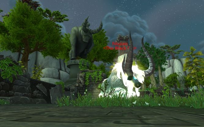 Mais je n’ai pas le temps de me perdre en admiration de bibelots qui restent après tout beaucoup moins impressionnants que moi-même. Avec fougue, je m’éloigne du rivage du Temps figé et m’enfonce plus avant dans la forêt à la recherche d’aventures stimulantes. Je terrasse quelques reptiles rampants, grues incongrues et même quelques yaks particulièrement yacariâtres, et découvre la cour des Astres vénérables. Tout autour, on trouve des résidents venus de Pandarie, marchands, hozen et – surprise ! voici Chen et Li Li Brune d’Orage. Ainsi que le célèbre Fo Sho Cogne Poings, le roi-singe, le vieux Patte des Hauts et, mazette, même Ling des Six Bassins ! Elle est renommée dans toute la Couronne de glace pour son amour du fromage.