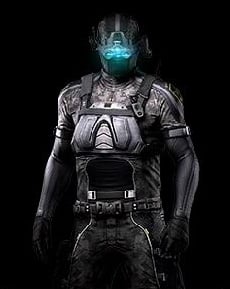 La tenue du Saboteur a deux énormes avantages. Premièrement, elle le rend invulnérable au marquage. Les Mercenaires sont donc incapables de le suivre dans ses mouvements. Deuxièmement, elle lui permet de détruire n'importe quel équipement électronique. Si ses bottes blindées peuvent lui être utiles en face à face, le bruit qu'elles font peut aussi révéler sa position aux ennemis. |