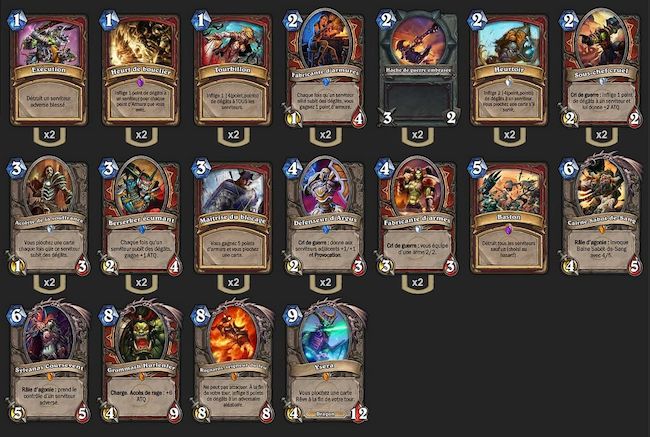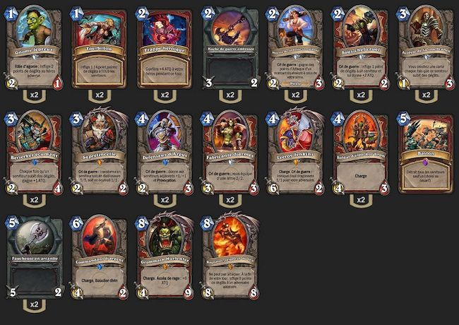 Pour démarrer la partie, nous aurons le Gnome lépreux, Hache de guerre embrasée, qui permettra de se combiner avec le Mousse de la Voile sanglante, Frappe héroïque... tout cela pour infliger un maximum de dommages en peu de temps. Viendra ensuite le Berserker écumant qui se combinera très bien avec un Tourbillon, ou un Sous-chef cruel, suivi d’une Fabricante d’armes, et Soldat d’élite Kor'kron, le tout pouvant être combiné avec un Défenseur d’Argus pour temporiser le jeu adverse. Si tout cela se déroule bien il vous suffira d’un Leeroy Jenkins, Commandant d’argent, ou d’une Faucheuse en arcanite pour finir la partie, mais si celle-ci se déroule mal Baston vous donnera un tour de répit. Si jamais la partie s’éternise, il vous restera Grommash Hurlenfer ou Ragnaros pour définitivement y mettre un terme !