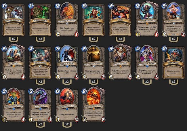 Si nous ne prenons pas en compte les Assassiner, tous les sorts ont un coût inférieur ou égal à 2 cristaux de mana, ce qui permet d’entrer facilement en synergie avec la mécanique de combos : Eviscération, Agent du SI : 7, mais aussi d’infliger de lourds dommages avec le Mage de sang Thalnos et le Drake Azur, voire même de piocher, Commissaire-priseur, Nat Pagle intervenant au « bon gré, mal gré de sa pêche ! »