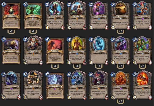 La liste ne perd tout de même pas une certaine capacité d’agression, avec les Mousse de la Voile sanglante qui entreront en combinaison avec le pouvoir héroïque et Poison mortel, Agent du SI:7, Golem des moissons, Commandant d’argent, pour finir notre Seigneurie Ragnaros viendra mettre un terme au rempart adverse si celui-ci se renforce.