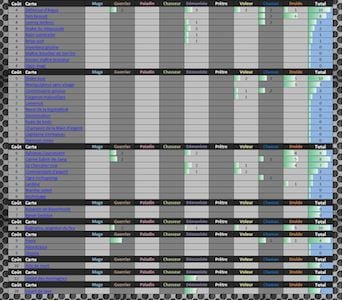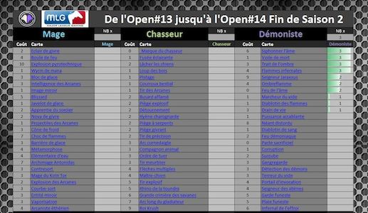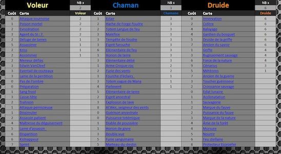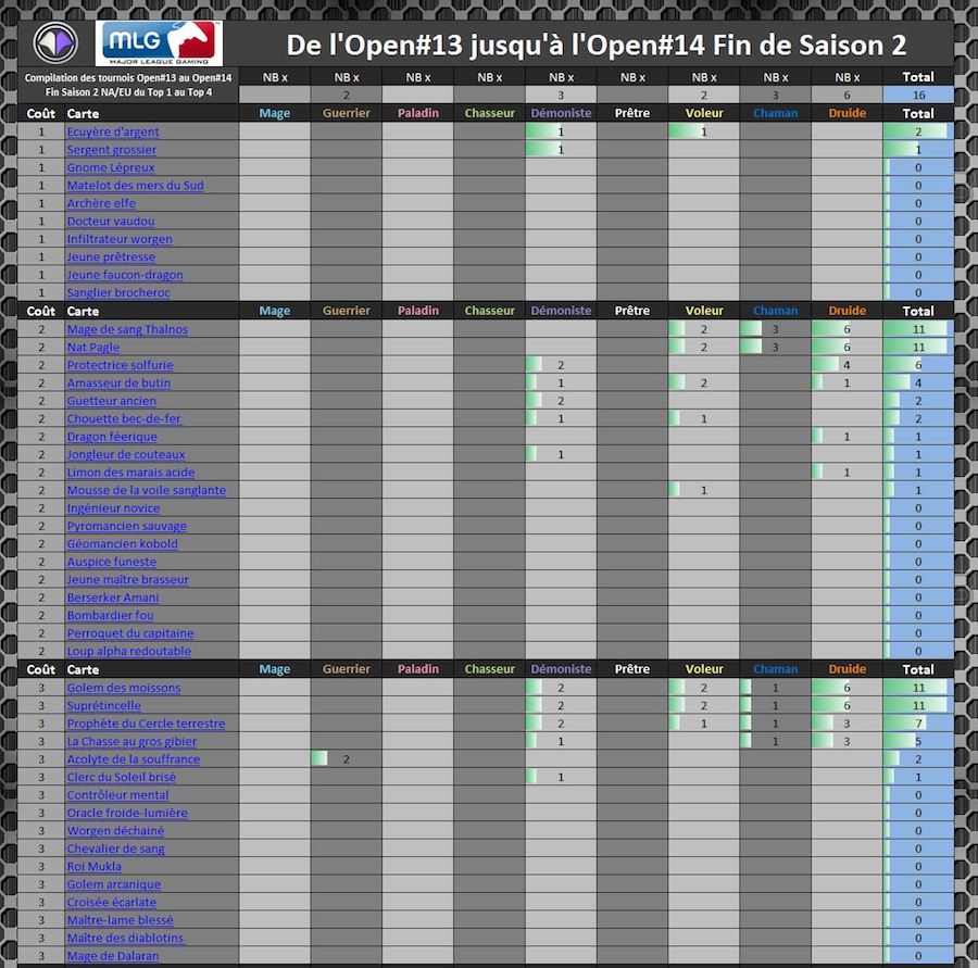 Voici la compilation pour ce classement. Ces tableaux sont composés de 16 Decks qui vont, du Top 1 au Top 4 Na/Eu, des tournois de la MLG. Vous pourrez voir dans ces tableaux le nombre de fois où une carte a été utilisée dans un deck. Nous avons donc le Druide à la première place. Derrière eux se trouvent, ex aequo, le Chaman et le Démoniste.