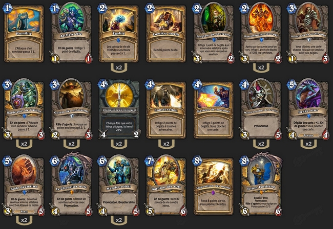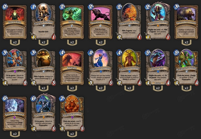 Cette liste est la même que celle que vous pourrez retrouver dans le recap de la meta de juin 2014 à deux cartes près : ek0p remplacera Mage de Sang Thalnos par un Chasseur de gros Gibier et Alextraza par un Marche-soleil.