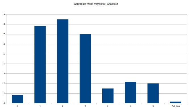 La plupart des decks Chasseur ont une composition similaire, c'est à dire très agressive. C'est d'ailleurs pour ce deck que l'on retrouve l'un des coûts en mana les plus faibles, avec un coût moyen de 2,53 mana par carte. La courbe de mana ce deck est clairement tendue vers la rapidité d'exécution, avec peu de cartes dépassant 6 de mana où l'on trouve la Grande crinière des savanes. Parfois Ragnaros pointe le bout de son nez, mais c'est assez rare.