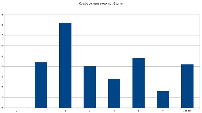 Le Guerrier joué en tournoi était un Guerrier contrôle avec un coût moyen par carte de 3,7, ce qui est relativement important par rapport aux decks aggro mais assez peu par rapport à d'autres jeux contrôle. Mais l'une des choses les plus étranges de ce deck, c'est qu'il comporte en moyenne 8,2 cartes coûtant 2, c'est presque autant que le Chasseur (8,5) alors que cet autre est un aggro. De ce constat on peut tirer deux conclusions : soit le Guerrier est très synergique et nécessite plusieurs cartes à bas coût pour le contrôle, soit le Guerrier profitent de cartes à bas coût qui sont individuellement forte dans une optique de contrôle.