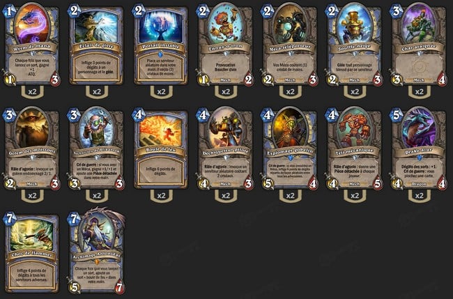 Pour compléter le panel de decks à sa disposition, Thefishou a opté pour un Mage méca. Ce deck est capable de mettre une très grosse pression rapidement, et de finir la partie en abusant d'Antonidas que vous pourrez faire proc très facilement avec les quelques pièces détachées que vous accumulerez au fur et à mesure de la partie.