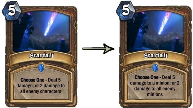 | Nouvelle mécanique | Choix des armes : Inflige 5 points de dégâts à un serviteur ou inflige 2 points de dégâts à tous les serviteurs adverses. |