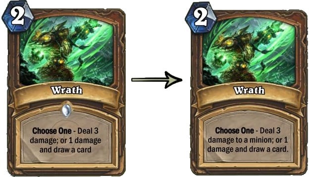 | Nouvelle mécanique | Choix des armes : Inflige 3 points de dégâts à un serviteur ou inflige 1 point de dégâts à un serviteur et vous piochez une carte. |