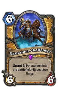 Suggestion de Lothar : Scout : Place un secret sur "Scout est un nouveau mot clé. Il révèle un certain nombre de cartes du haut de votre deck (4 dans ce cas là) et vous devrez suivre la mécanique indiquée par l'effet Scout. Les cartes qui ne seront pas choisis seront placées vers le bas de votre deck. L'Adversaire mystérieux aurait cette règle qui s'appliquera 3 fois, ce qui le rendrait suffisamment fort pour placer un total de 3 secrets sur le terrain." |