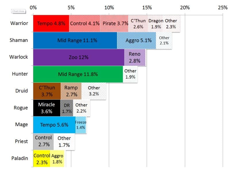 En vrac : Le Rogue Miracle, le Mage Freeze et le Paladin N'Zoth, bien plus efficaces en tournoi, se font de plus en plus rares sur le Ladder. Le Druide, encore en train de panser ses plaies après ses violents nerfs, reste assez marginal même si des versions Ramp, C'thun ou Token/Yogg Saron restent relativement viables. Le Mage Tempo, à l'instar du Druide a bien du mal à convaincre depuis le passage en Standard, et c'est un peu le même problème que rencontrent le Prêtre et le Paladin : la perte de cartes cruciales a rendu ces archétypes très instables, bien trop faibles comparés aux autres decks du Top Tier.