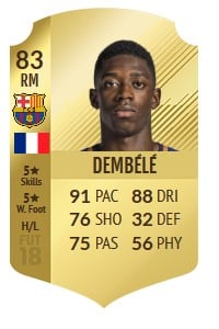 Dans la catégorie des jeunes promesses françaises, Ousmane Dembélé n'est pas mal non plus. Même constat avec lui puisque malgré sa note de 83, en jeu il est vraiment impressionnant, rapide, très technique et il est doté d'une grosse frappe du pied gauche même si son physique peut parfois lui faire défaut. |