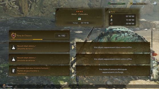 - L'objectif des quêtes d'arène n'est pas juste de tuer le monstre, mais de le tuer aussi vite que possible. Votre temps déterminera votre note, ainsi que les récompenses dans une certaine mesure. En contrepartie, aucun matériau de monstre n'est obtenu.