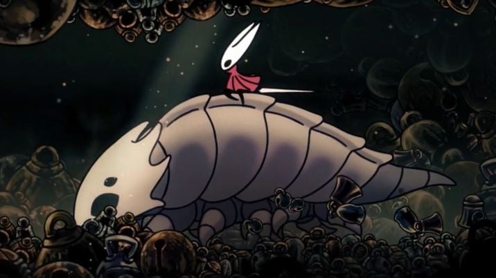 - Le début du jeu est assez linéaire, même s'il n'en donne pas forcément l'impression. Il n'existe qu'un seul trajet, avec des culs-de-sac ou des passages pour le moment infranchissables. Il vous mènera à l'Antre, situé dans la zone au-dessus du village de départ du Gouffre d'os. Vous allez finir par croiser une grosse créature prisonnière d'une toile de soie, mais elle ne peut pas être libérée initialement, puisque les fils réapparaissent trop vite.