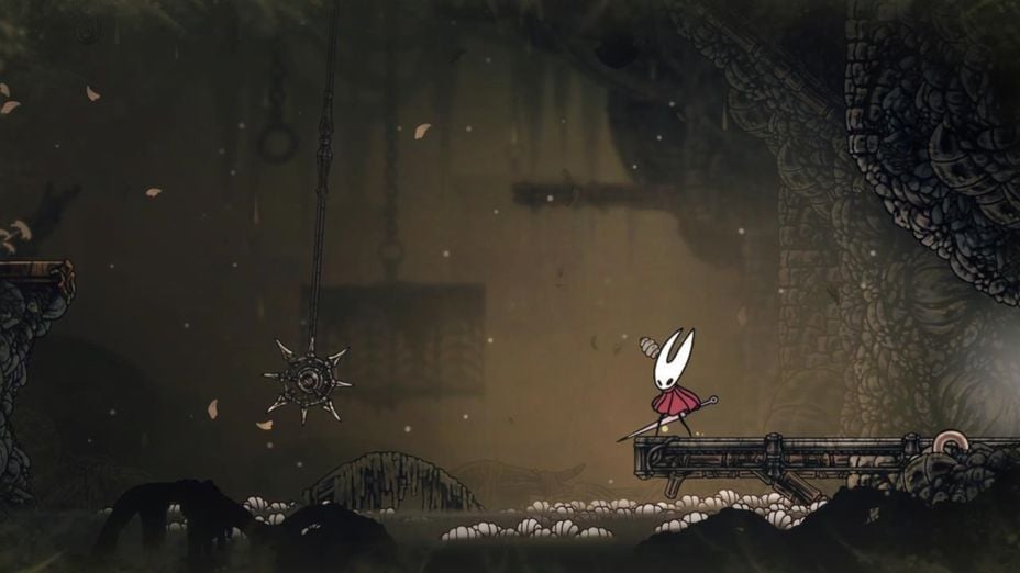 Dans la salle suivante, résistez à la tentation d’actionner le levier central : il déclenche un plongeon forcé dans une mare grouillante de vers. Ceux-ci infectent Hornet, l’empêchant de se soigner jusqu’à l’utilisation d’une bobine de soie. Contournez donc ce piège et avancez jusqu’au fond du couloir.