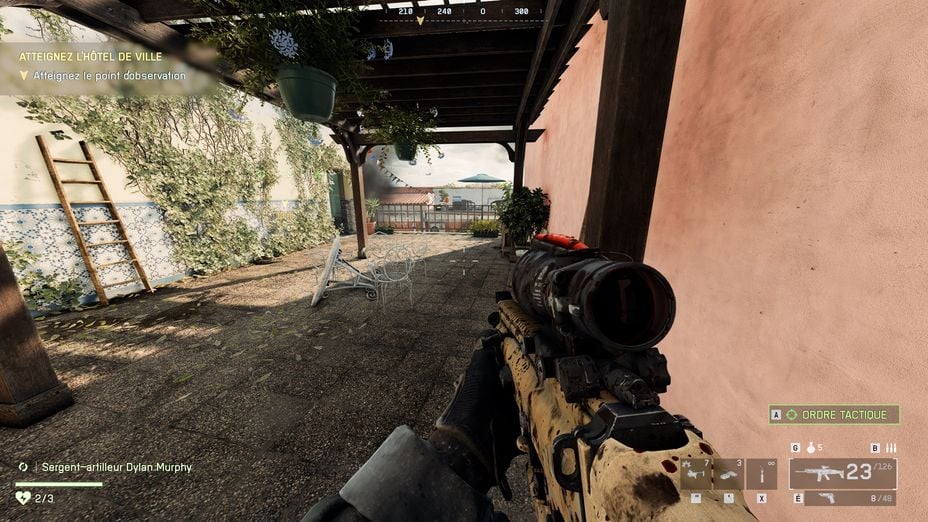 Lorsque vous aurez escorté le blindé et rejoint votre escouade pour sécuriser un point d’observation offrant une vue sur l’hôtel de ville, regardez autour de la terrasse recouverte de végétation. Sur une petite table d’appoint à droite, vous trouverez le deuxième objet à collectionner du chapitre.