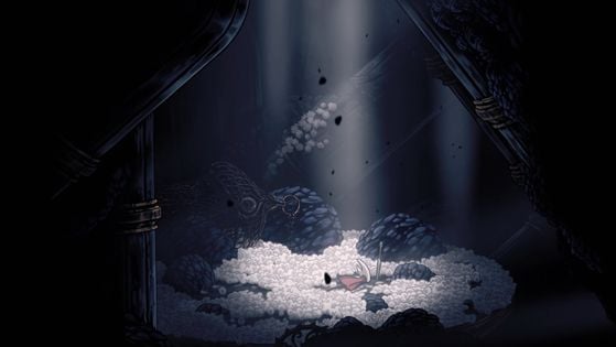 - Le Cerf pâle n'attaque pas directement, mais il invoque de plus en plus de projectiles qui vont voler vers la position de Hornet, ce qui les rend parfois difficiles à esquiver en fonction de leur configuration et de votre position initiale. Une méthode assez simple pour les éviter, du moins, dans la section droite de la salle est de se réfugier dans l'eau. Presque tous les projectiles vous passeront automatiquement au-dessus de la tête.