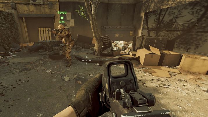 Après être sorti du char pour la première fois, vous devrez ouvrir la voie afin de rejoindre l’escouade Vortex. Dans la cour du premier bâtiment que vous traversez, regardez sur la droite, près des nombreux cartons. Au pied d’un arbre, vous trouverez le premier objet à collectionner du chapitre.