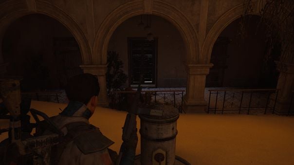 - Après avoir nettoyé la zone, descendez dans la cour centrale, qui porte mal son nom, puisqu'elle est couverte. Inspectez la fontaine ensablée pour trouver le colis caché.