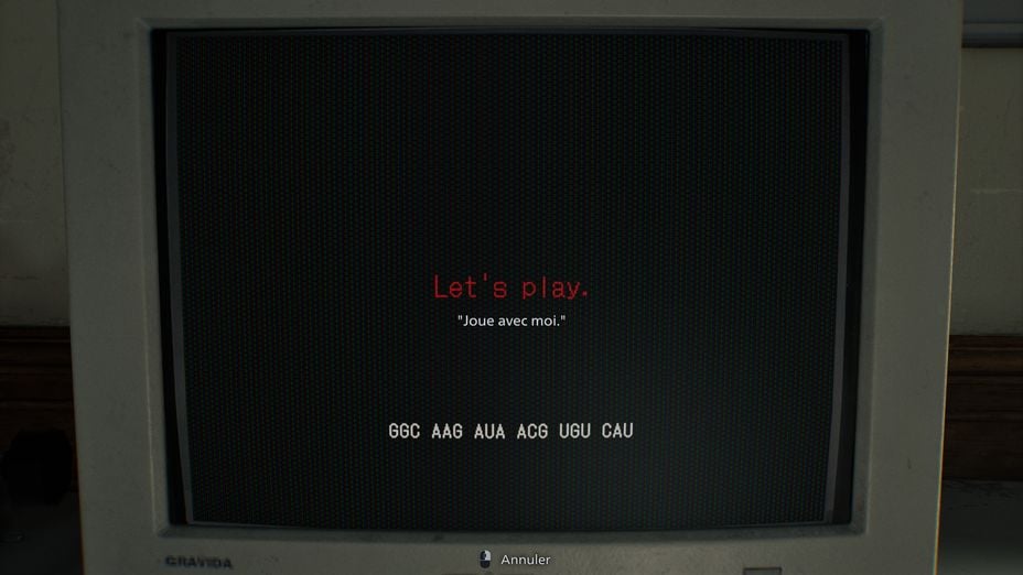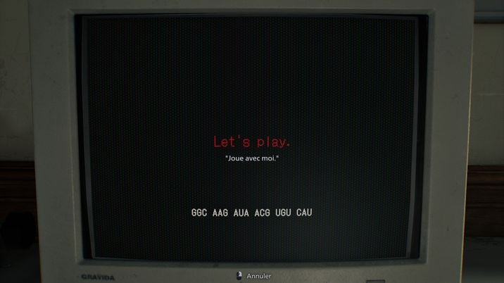 - La première étape consiste à ramasser la Main coupée de la Fille en remontant du Sous-sol et à l'analyser avec un des microscopes laser du Centre de soins, comme un échantillon de sang. Cela fera apparaître un message cryptique "Joue avec moi", ainsi qu'un code ressemblant à une séquence ADN : "GGC AAG AUA ACG UGU CAU".