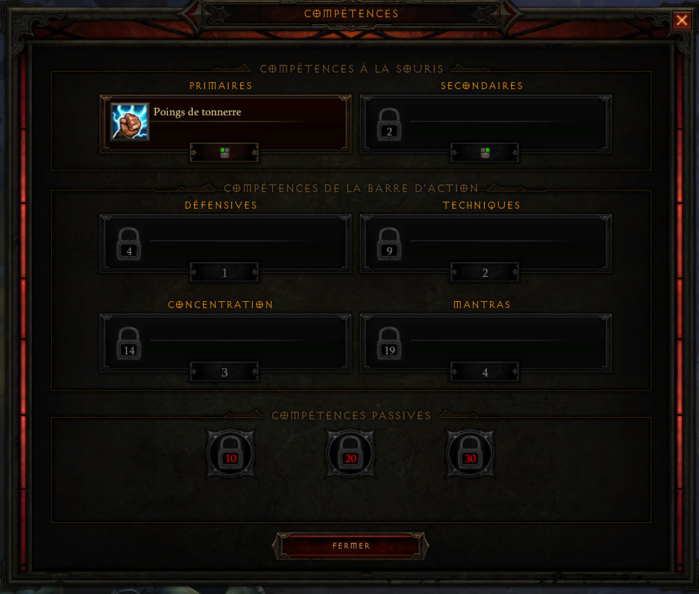 Comme vous pouvez le voir ici, vous débloquez les différentes catégories en progressant en niveaux. À chaque fois que vous débloquez une nouvelle catégorie, vous gagnez un emplacement de technique, et un raccourci clavier. Les techniques et les runes sont gagnés au fur et à mesure entre le niveau 1 et 60.