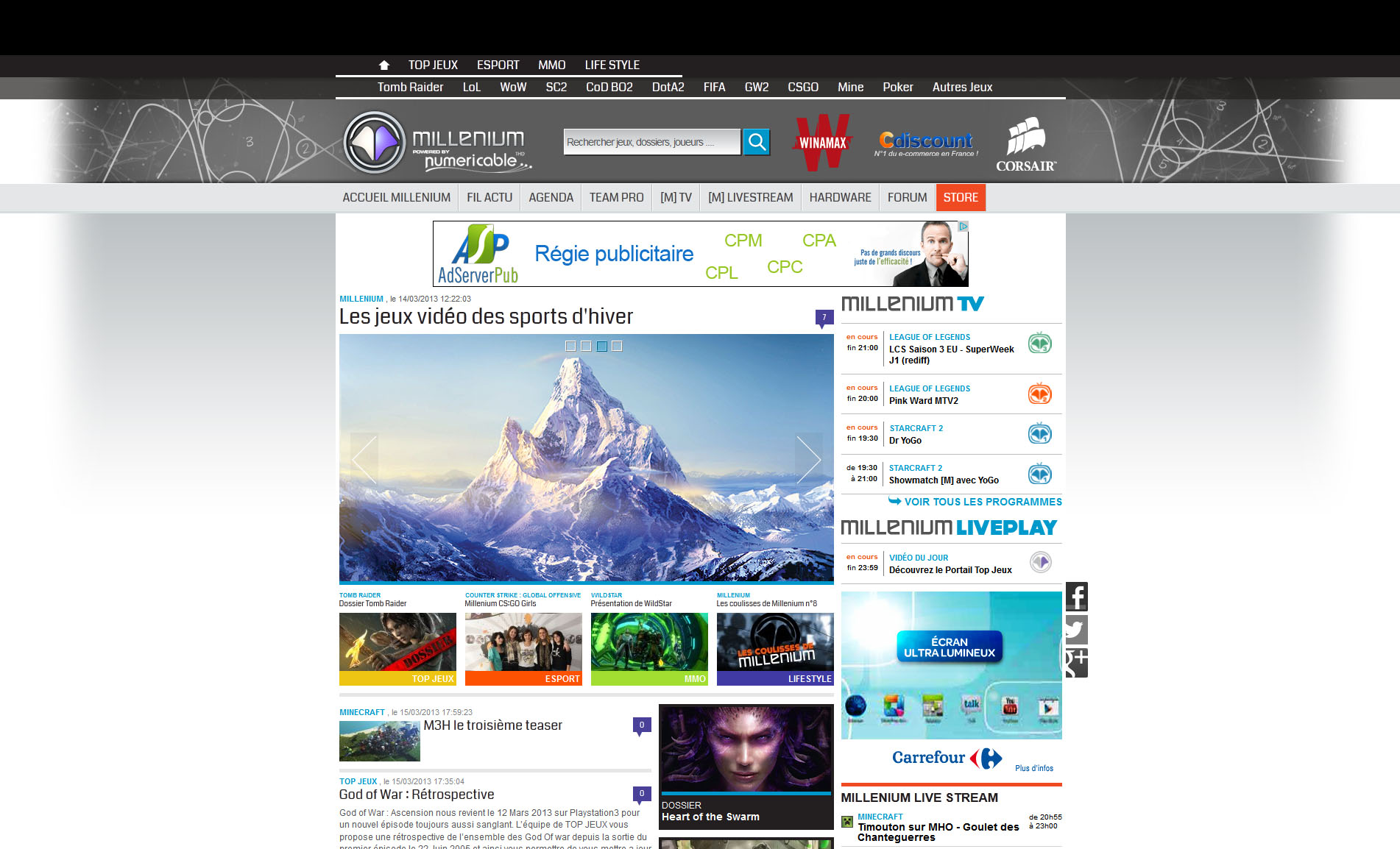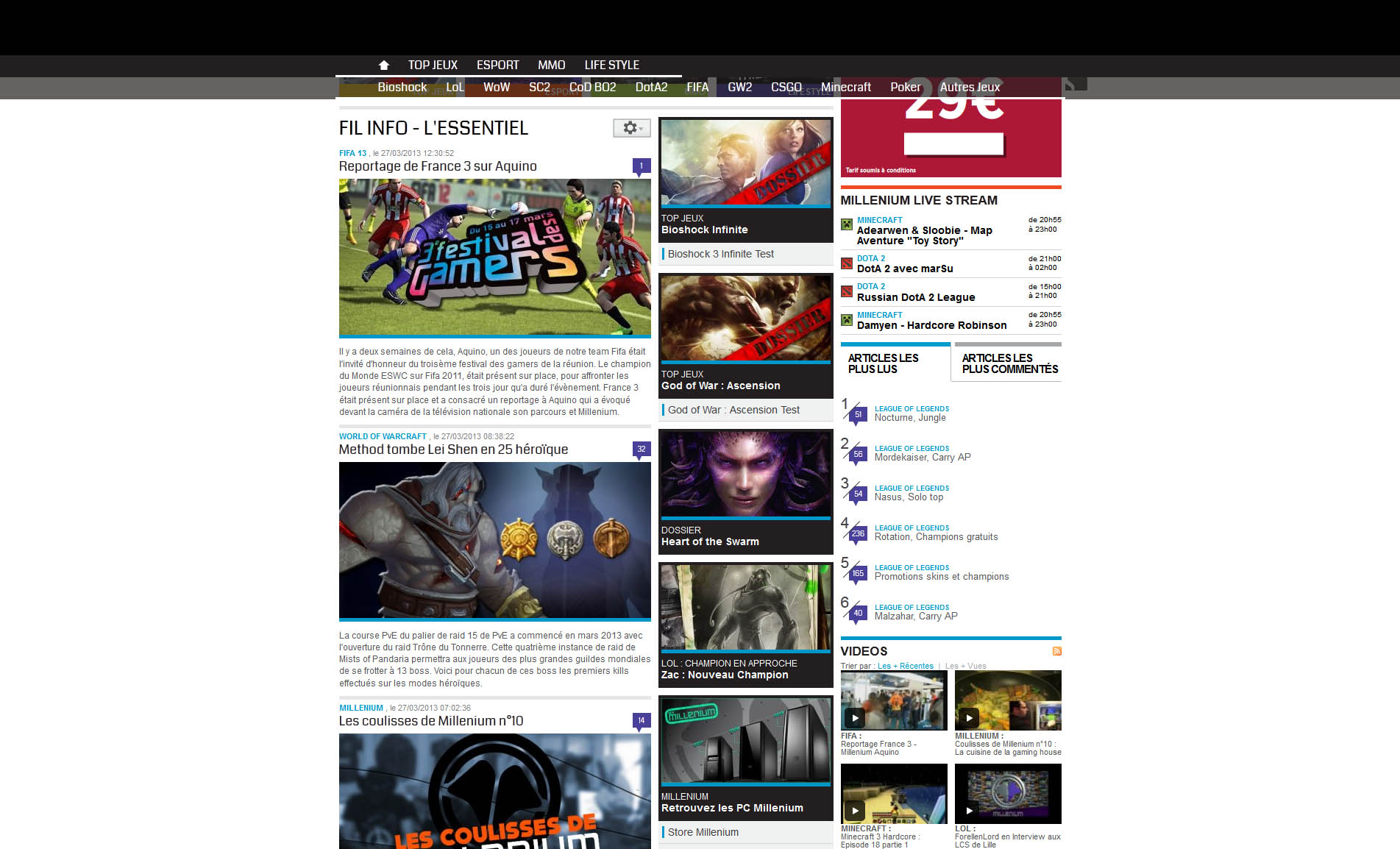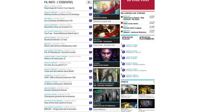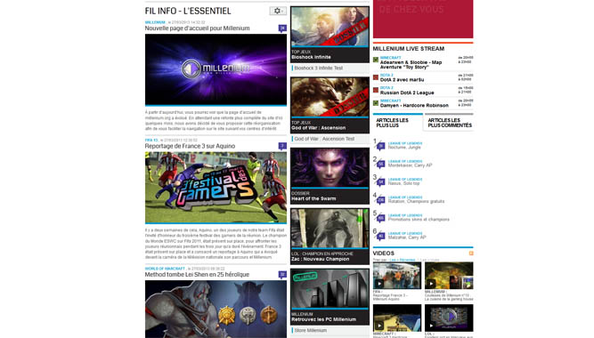 eSport : Le sport électronique est lié à Millenium depuis longtemps. En plus de posséder plusieurs équipes de compétition, notre structure est également le premier site francophone sur le sport électronique. Vous trouverez maintenant regroupé sur ce nouveau portail toute l’actualité de l’eSport qu’il s’agisse de Starcraft 2, League of Legends, Call of Duty, Counter Strike ou encore Fifa. Ainsi, vous ne raterez rien de la vie du milieu, des compétitions et des transferts du moment, en ayant ainsi accès à toute l’actualité eSport depuis une seule page.
