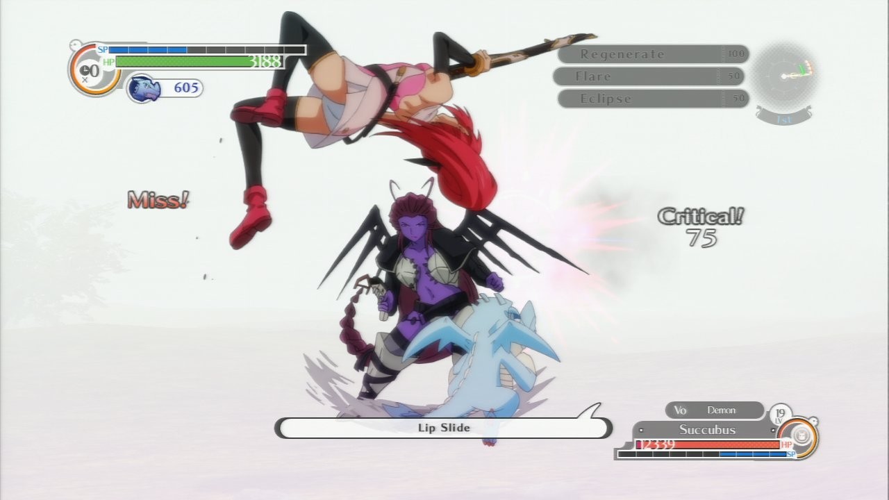 Vous n'avez rien compris au scénario ? Pas grave, le système de combat original sauve ce jeu d'une note absolument catastrophique à lui tout seul. Les rencontres avec les monstres sont complètement aléatoires comme dans 90% des RPGs et s'ouvrent sur une arène : jusque là, rien d'anormal. Pourtant, le système de combat est très nerveux : l'héroïne peut attaquer à l'aide de son fusil ou de son épée pour remplir sa jauge de SP, points nécessaires pour lancer les moindres techniques spéciales ou sortilèges, mais elle peut également esquiver les attaques de ses ennemis en déplaçant le stick vers la gauche ou vers la droite avec le bon timing. Le timing est d'ailleurs un facteur essentiel de ces joutes, les ennemis ayant un schéma d'attaque prédéfini qu'il faudra connaître par cœur pour pouvoir finir les combats sans prendre le moindre dégât. Alors oui, il en résulte un jeu pas très difficile (surtout qu'on trouve des potions à foison dans ce jeu) mais ce système de combat très nerveux nous permet de ne pas ressentir de lassitude après le vingtième combat. Le fait que les personnages ainsi que les ennemis soient en 2D ne gênent en rien les joutes d'un point de vue visuel et le tout reste assez fluide pour que l'on comprenne quand esquiver au bon moment. Les joutes ne peuvent cependant accueillir qu'un ennemi à la fois (c'est déjà suffisamment chaud avec un seul ennemi, je peux vous l'assurer) si bien qu'une fois votre adversaire défait, la caméra tourne sur un autre comme s'ils faisaient la queue pour se faire tuer.