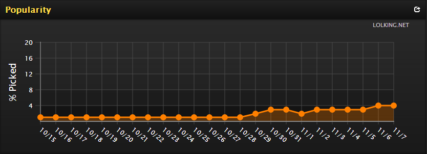 Son taux de popularité est en hausse depuis le 29 (peut-être est-ce dû à l’annonce du up de Ziggs ?) et depuis, il est en constante augmentation. Peut-être un must pick en S4 ? Seul l’avenir nous le dira.