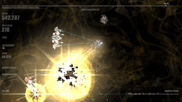En cours de partie, des bonus modifieront les effets de la musique. Il en existe deux types : volume et puissance. Le bonus puissance ne modifie pas la musique mais les dégâts occasionnés par vos tirs sont augmentés. Le bonus volume quant à lui augmente, comme son nom l'indique, le volume de la musique. Lorsque les jauges de puissance et de volume sont à fond, vous entrez en mode Beat Hazard ! Un rayon laser très puissant accompagne alors vos tirs jusqu'à ce que la mort vienne vous chercher. Mais la musique du jeu est elle bonne au moins ? Eh bien sachez que vous jouez sur vos propres musiques ! Laissez libre cours à vos styles musicaux !