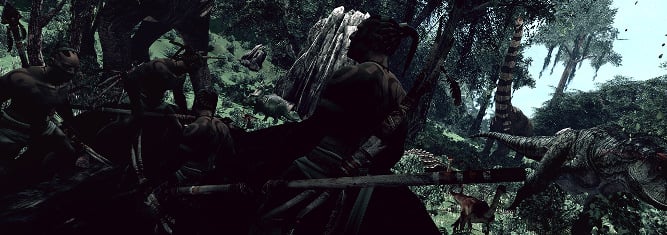 Vos instincts carnivores refont surface ? Tant mieux ! En effet, la chasse sera votre seule source de nourriture sur cette île de Wayneth. Tuer le « petit gibier » sera chose aisée : bandez votre arc, tirez et, si vous touchez la cible, un repas de choix s'offre à vous. Cependant ne pensez pas que la viande vous tombera dans les mains en claquant des doigts ! Si vous réussissez à abattre un Galimimus par exemple, vous devrez alors vous précipiter sur sa carcasse. Récupérer vos précieuses denrées alimentaires prend du temps mais le sang de l'animal coule et attire les grands carnivores. Ainsi, en tuant un dinosaure, vous pourrez sûrement récupérer beaucoup de viande mais si vous ne vous dépêchez pas, vous finirez en chair à pâté pour T-Rex !