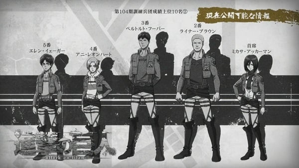 Armin Arlelt : C'est le meilleur ami d'Eren et de Mikasa qui décidera aussi de les suivre jusqu'au bout dans leur quête de vengeance. Souffre-douleur des petites frappes du village de son enfance, il est protégé par Eren et Mikasa et révèle de grosses faiblesses physiques. Il compensera son manque de talent de chasseur par son intelligence et son charisme. Son but est de pouvoir un jour explorer le monde en compagnie de ses amis.