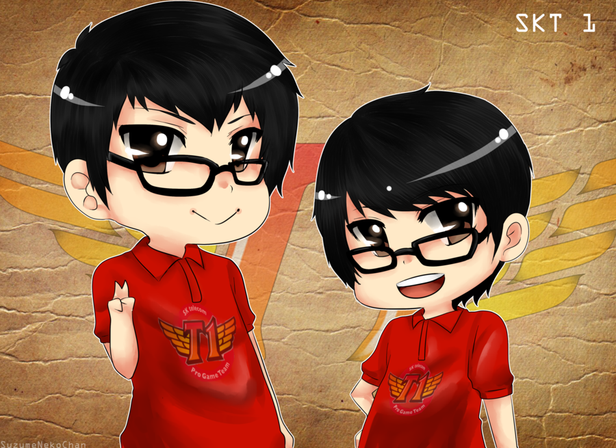 Mais toutes les représentations que proposent les artistes de leurs équipes favorites ne sont pas aussi sombres que celles que nous venons de voir. On trouve en effet des entre-deux, plus gais et moins réalistes. C'est notamment le cas chez SuzumeNekoChan, dont on peut retrouver l'hommage aux SK Telecom T1 sur sa page Deviantart. Bon, je sais, il ne s'agit ici que de deux membres et pas de l'équipe entière, mais je fais avec ce que j'ai. Les joueurs - PoohManDu et Piglet - ne sont pas forcément très reconnaissables sans indication de l'artiste (du moins, pour mes yeux de noob) mais l'ensemble est tout de même sympathique. Ils deviennent presque des personnages de manga (pour ne pas parler du genre kawaï), et exhibent fièrement le tee-shirt de leur équipe, sur un fond louant cette même équipe, au cas où nous n'ayons pas compris de quelle équipe il s'agissait