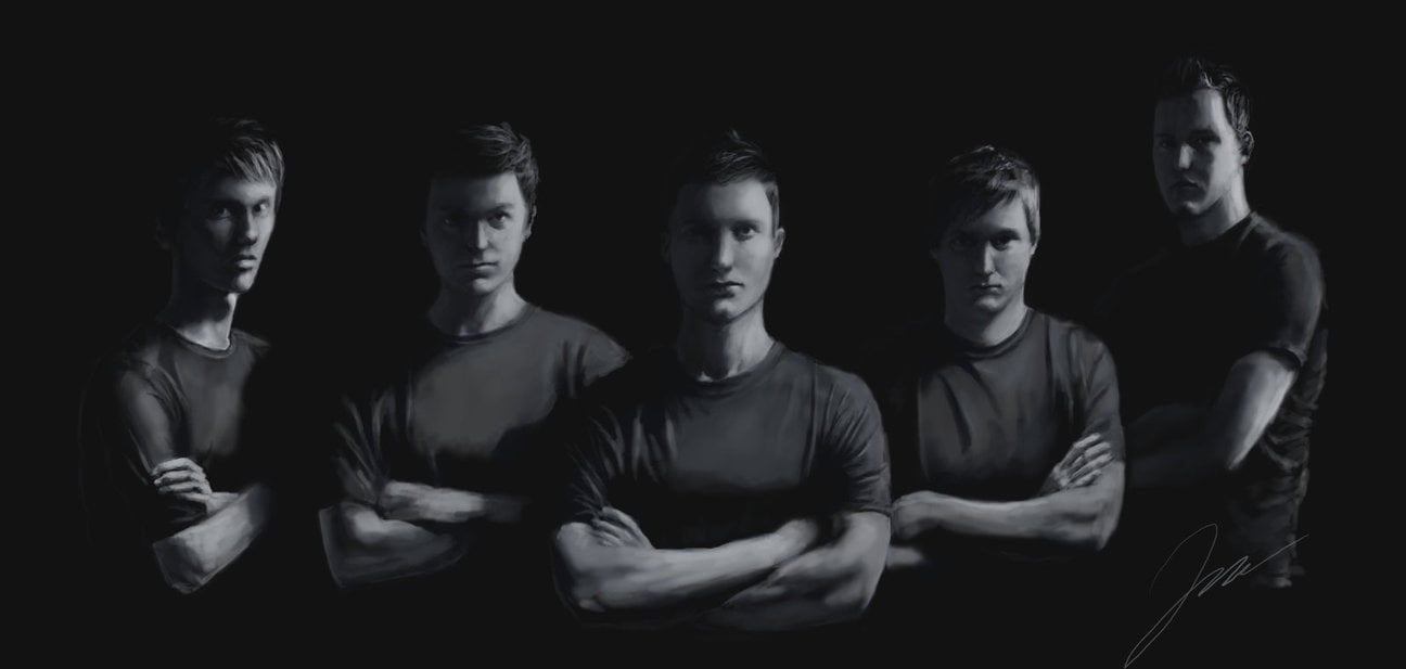 La compétence, c'est du sérieux, comme nous venons de le voir. Yaztory semble partager cet avis, la menace directe en moins, puisque l'on peut retrouver sur sa page Deviantart un hommage à l'ancienne line-up des Evil Genuises. Plus sobre, il s'agit ici d'un portrait des cinq co-équipiers, dont les traits ne sont signifiés que par un jeu d'ombres et de lumières, puisque l'artiste vient simplement appliquer du blanc sur un fond noir pour donner forme à son sujet. On peut souligner la grande maîtrise de la technique, puisque les joueurs sont particulièrement réussis - on peut même sentir en eux la détermination.