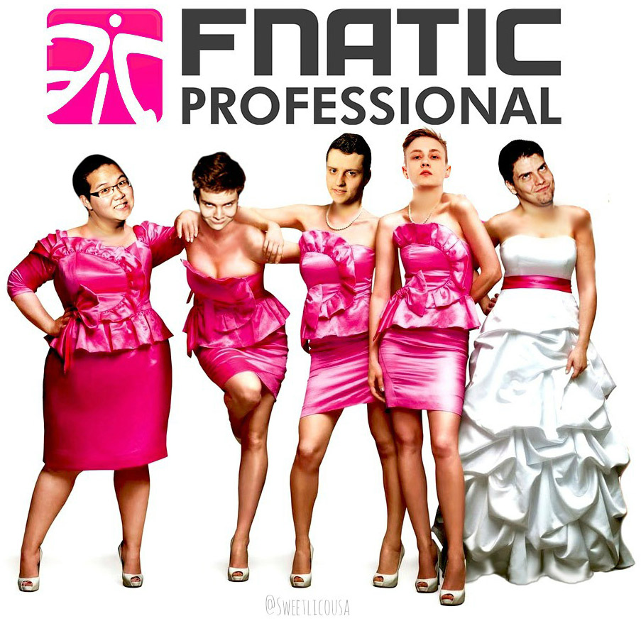 Mais l'artiste nous proposant le plus gros décalage du jour est sans doute Xenoluxy, et pour preuve : cette œuvre que l'on peut retrouver sur sa page Deviantart. S'il s'agit d'un simple montage (pas des mieux réalisés, au demeurant), le résultat est néanmoins très distrayant. Les joueurs de la célèbre équipe Fnatic entrent ici dans la peau des héroïnes de Bridesmaids, film fait avec et pour les filles (je ne jugerai pas les quelques agneaux égarés). Nos joueurs sont plus resplendissants que jamais dans leur robe fashion, et seul leur sourire peut rivaliser avec leur charisme. De quoi rendre fanatique et voir la vie en rose.