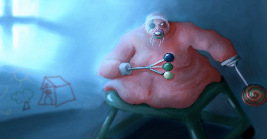 Comme on peut parler d'enfance du dessin avec les œuvres précédentes, intéressons-nous maintenant à l'enfance du champion, puisque Ragamuffyn nous propose sur sa page DeviantArt un skin Bébé pour Urgot. Le résultat positivement (voire négativement, en l'occurrence) effrayant, pour ne pas employer le terme « glauque ». Les contours, assez flous et mous, accentuent la monstruosité du champion. L'ambiance sinistre souligne cela grâce à un traitement de la lumière qui efface toute réelle netteté. Bébé Urgot n'est pas vraiment mignon, et ni ses armes ni les dessins au mur ne permettront de nous rassurer. L'ensemble est très efficace et bien réalisé.