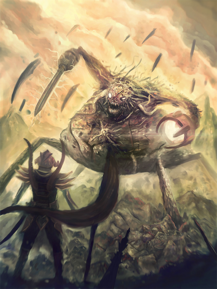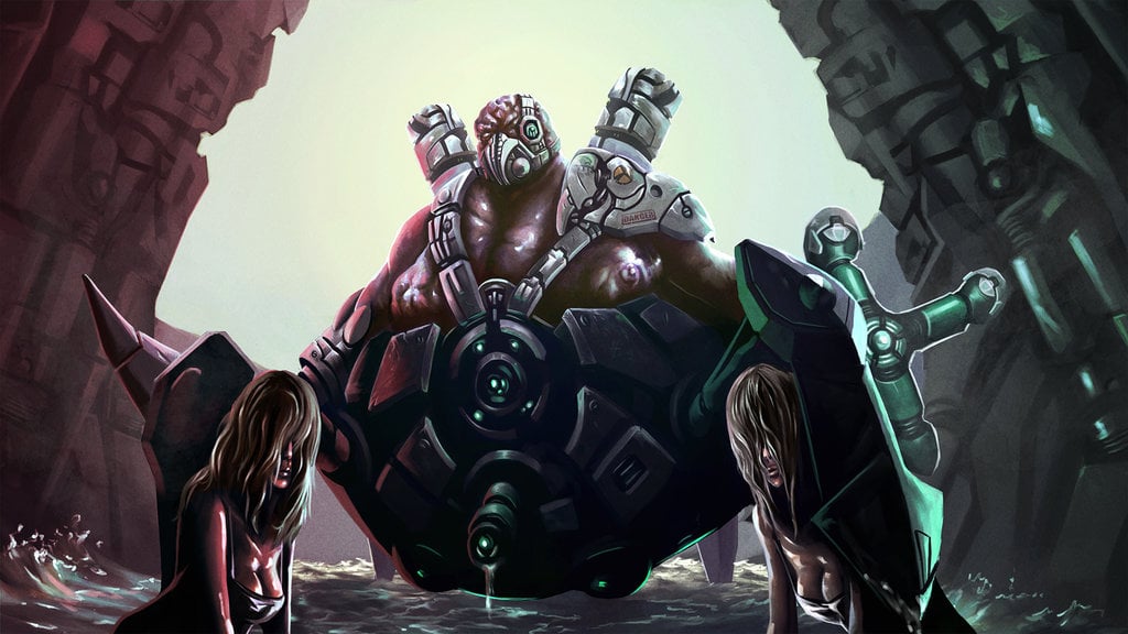 L'histoire a donc dessiné physiquement le champion qu'est Urgot, et elle continue à le redessiner. 3abden nous propose sur sa page DeviantArt une très belle représentation d'un Urgot gigantesque en plein combat. Il est particulièrement effrayant de par sa taille et son visage, plus horrible que jamais. Si le dessin est globalement plutôt flou, sans réel contour ou trait net, la couleur seule dessinant l'ensemble, le visage est, lui, particulièrement précis. La palette de couleurs, de l'orangé au vert, est douce, mais elle est aussi le signe d'une fin dramatique à coup de bombe et de sang, et c'est sur ce suspens insoutenable que s'achèvera cette Galerie. À la semaine prochaine !