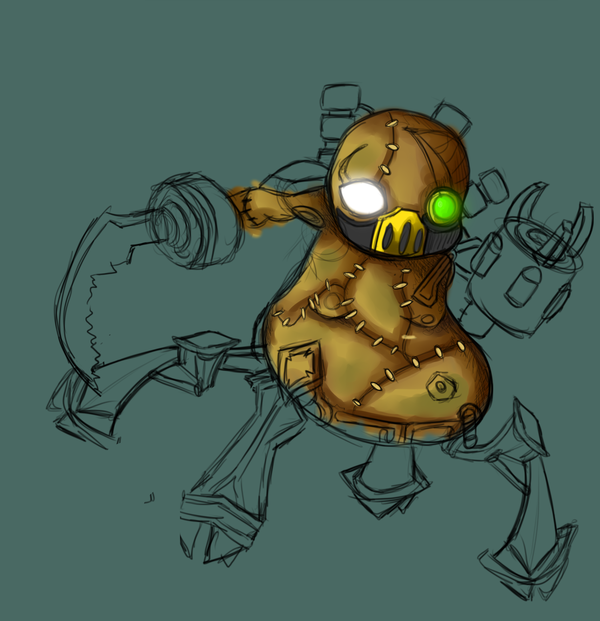 La réécriture que nous propose NerdyNation sur sa page DeviantArt est ici incomplète, puisque la colorisation n'est pas poussée jusqu'au bout pour ce Chibi d'Urgot. On aime encore une fois l'effet « croquis » de l'ensemble (par la couleur qui dépasse et les traits brouillons, pour un résultat inachevé) même si l'on peut souligner la grande précision dont fait preuve la partie avancée du dessin. S'il est censé être mignon, le champion garde ce caractère étrange voire effrayant. Le travail sur la luminosité de l'œil est bien réalisé, et y contribue.