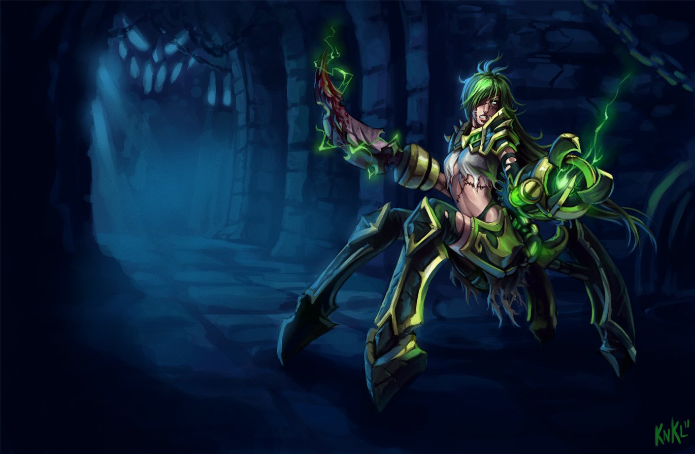 L'œuvre que nous propose Knockwurst sur sa page DeviantArt est beaucoup moins glauque car le décalage est bien moins extrême (quoique...) pour cet Urgot version féminine. Le champion qui perd un peu de sa laideur, et donc de sa superbe, du fait qu'il soit désormais mince (que Dieu nous protège des bourrelets féminins !) et que son corps soit désormais quasiment intact, à l'exception d'une cicatrice purement esthétique. Le caractère de patchwork est uniquement représenté par les jambes-pattes et les bras. L'ensemble est très précis dans sa réalisation, dans le trait comme la colorisation, et on aime l'effet de focus, le décor étant flou pour mettre en valeur le personnage.