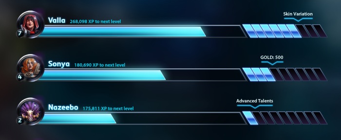 Chaque héros commence au niveau 1 ; plus vous jouez avec un héros particulier, plus il progresse vers le niveau suivant. Il y a 10 niveaux en tout pour chaque héros. Après le premier niveau, votre héros remporte des récompenses spéciales à chaque niveau acquis. Le tableau ci-dessous détaille les récompenses octroyées à chaque niveau de héros :