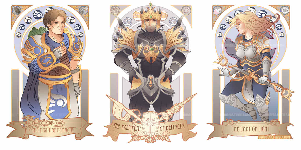 Et c'est donc aux côtés de deux autres fidèles citoyens de Demacia que nous avions rencontrés la semaine passée que betrayal-and-wisdom représente sur sa page DeviantArt notre chère Lux. Dans un style Art-déco plutôt bien imité, les trois champions composent donc un triptyque unifié dans les codes et les couleurs : mêmes teintes jaunes et grises, mêmes symboles, le lien entre les trois champions est donc évident. L'ensemble répond bien aux codes de ce genre graphique, particulièrement Lux qui ressemble aux innombrables jeunes femmes qu'a pu représenter Mucha, et les petits clins d’œil sont nombreux, notamment les objets dans les coins supérieurs de chaque partie.