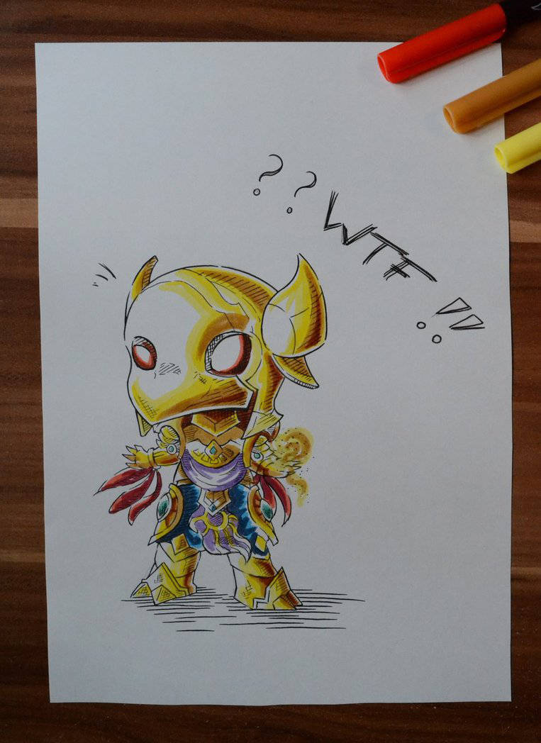 Basculons maintenant franchement dans le monde tout en rondeur des chibis avec cette œuvre signée Lighane, et que l'on peut donc retrouver sur la page DeviantArt de l'artiste. Si le style chibi n'est pas du goût de tous, on peut néanmoins souligner la précision du trait et de la colorisation, le jeu entre les deux permettant de bien définir le champion. Par ailleurs, outre le problème de la luminosité, on aime cette mise en scène du dessin, qui serait de l'ordre de la métafiction si l'on parlait littérature : le dessin prend en effet conscience de sa propre existence, Azir s'indignant de sa condition, le cadrage nous offrant par ailleurs clairement de voir qu'il s'agit d'un bête gribouilli sur une feuille de papier, limitant dès lors l'existence de notre personnage au statut de dessin.