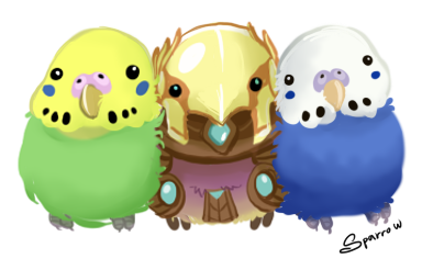 Je vous parlais du regard attendri que posait la communauté sur notre nouveau champion. Voici donc un petit clin d'œil. LittleDarkDragon a décidé de pousser le vice à l'extrême en représentant, sur sa page DeviantArt, notre oiseau du désert parmi les siens. Azir se fait ici plumer, puisqu'il est représenté au milieu de petites perruches toutes aussi mignonnes que lui. Si le décalage fait sourire, et le dessin plutôt simple, il n'en est pas moins bien réalisé : la colorisation est efficace et rend très bien le contraste entre plumes et métal luisant.