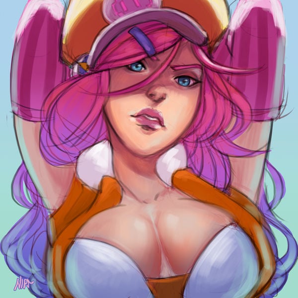 On peut remarquer cet attrait commun parmi les artistes de placer Miss Fortune arcade sur un fond bleu (qui s'explique par la dominante orange de la championne, couleur complémentaire du bleu) : c'est effectivement le cas dans cette œuvre que nous propose N1PS sur sa page DeviantArt. Ici, il n'est plus question de réalisme, et la moue devient clairement plus boudeuse. Le trait est affiché, et ce n'est pas pour déplaire. La représentation est fidèle et juste, du point de vue anatomique, et le traitement de la lumière permet d'ajouter une pointe de relief bienvenue à l'ensemble.