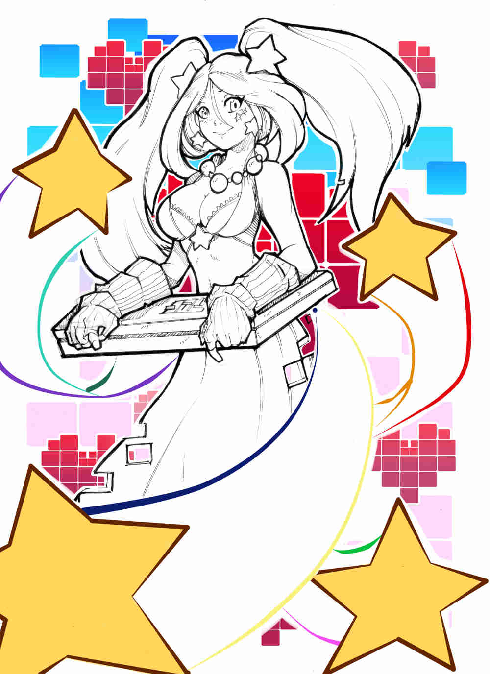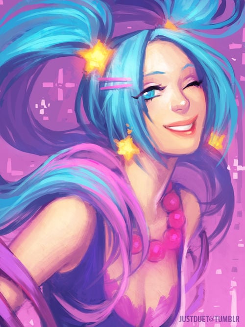 L'interprétation que nous propose justduet sur sa page DeviantArt est encore plus légère que la précédente, et ce par la couleur comme le trait. La trace du pinceau est ici bien plus visible, les contours bien moins nets, et les couleurs bien plus lumineuses. Sur un fond rose bonbon, Sona est souriante. L'ensemble est par ailleurs un peu moins statique, sans doute grâce à la position de la championne, mais aussi par les ajouts de ces croix signifiant des clignotements et le trait moins précis du dessin. La représentation anatomique est cependant très juste, et il en est de même pour le traitement de la lumière et des ombres.