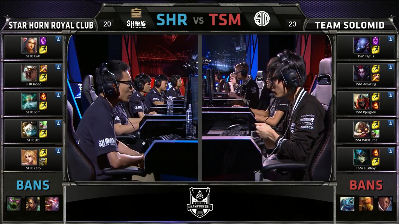 Les Américains sont cette fois-ci redside, ce qui signifie qu'ils n'ont pas le first pick. les SHRC décident de bannir trois toplaners pour mettre Dyrus dans une zone inconfortable, alors que les TSM choisissent de retirer du jeu le Fizz de corn, le Lee Sin d'inSec et le Lucian de Uzi. Le first pick sera Zilean, qui peut être joué midlane comme support, mais les TSM ripostent avec leurs deux sololaners : Ryze et Zed. Le choix de Zed est discutable, puisque Zilean pourra le mener à mal sur la midlane avec sa portée et sa capacité à revivre après le combo de Zed ; les TSM prennent quand même l'assassin pour split push plus tard dans la partie, quitte à subir légèrement en phase de lane. inSec décide de prendre Rengar, et le jungler coréen sera l'élément clé de la partie : La composition des SHRC est composée de trois carry avec Irelia, Rengar et Tristana, qui se feront accélérer par Zilean et le passif de Janna, auront de la survivabilité supplémentaire avec les boucliers, les soins et la résurrection et un bonus non négligeable d'AD grâce au bouclier de Janna. Une composition bien rodée dont le rôle sera d'assassiner une personne très rapidement avec l'ultimate de Rengar, et de pouvoir prendre les teamfights malgré l'absence de Zed en train de split push : contrer le split push par la hard engage est toujours une bonne idée, surtout si vous arrivez à tuer quelqu'un très vite avant que le split pusher n'ait le temps de prendre un objectif.