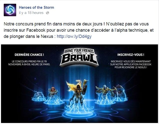 Blizzard annonce sur son Facebook qu'il vous reste jusqu'au 19 Novembre, 8h59, heure de Paris, pour vous inscrire sur l'application "Bring your friends to the Brawl" pour avoir la chance d'obtenir un accès à l'Alpha d'Heroes of the Storm.