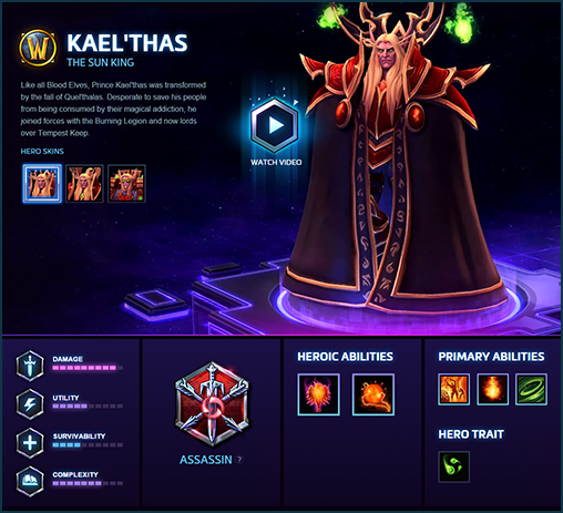 Après avoir vécu de nombreuses aventures épiques dans l'univers de Warcraft, Kael'thas a choisi d'endosser dans Heroes of the Storm le rôle d'un assassin spécialisé dans la magie du Feu. Capable d'améliorer ses propres sorts et de créer de puissants combos, il instille la peur dans le cœur des héros et serviteurs ennemis les plus coriaces. Sa maîtrise des arts magiques en fait en outre un compagnon très prisé par tous ceux qui entendent s'imposer dans le Nexus !
