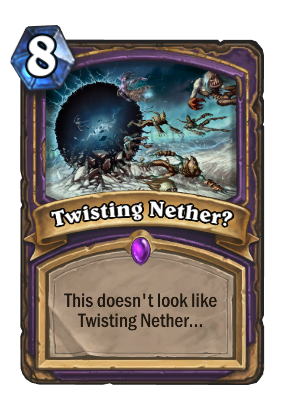 | Secret : lorsque votre adversaire à 9 cartes ou plus dans sa main, réduit le coût des cartes dans la main des deux joueurs de (1). | Râle d'agonie : les deux joueurs gagnent une arme aléatoire ce tour-ci. | Ceci ne ressemble pas à un Néant distordu... |