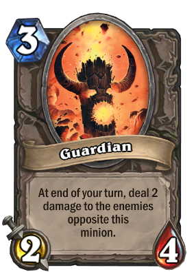 | Inflige 3 de dégâts. | Invoque deux Gardiens 2/4. | A la fin de votre tour, inflige 2 points de dégâts aux ennemis en face de ce serviteur. |