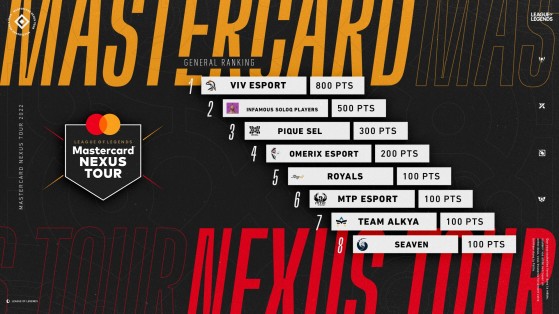 Le Mastercard Nexus Tour se divise en plusieurs étapes, 7 au total. Elles se jouent au rythme d’un week-end tous les mois et offrent des points de circuit aux huit premières équipes de chaque étape, selon leur résultat final.