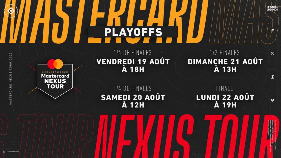 Lors de ces playoffs, qui se joueront du vendredi 19 au lundi 22 août, les 8 qualifiés sont séparés en 2 groupes, dont les 2 meilleures équipes sortiront pour s’affronter en demi-finale au cours d’un BO5. Les deux vainqueurs des demi-finales se retrouveront non seulement en grande finale, mais également qualifiés pour les Up & Down Division 2/Mastercard Nexus Tour, qui offriront la possibilité à ces deux équipes d’obtenir leur place dans l’antichambre de l’élite française de League of Legends.